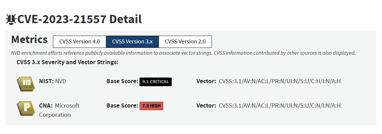 Provider CNA analysis takes priority over NVD analysis. For example, CVE-2023-21557 was determined to be 7.5 by Microsoft (Provider CNA) and 9.1 by NVD. The NVD API shows the Microsoft vector as the primary one, and Minimus will show it accordingly.